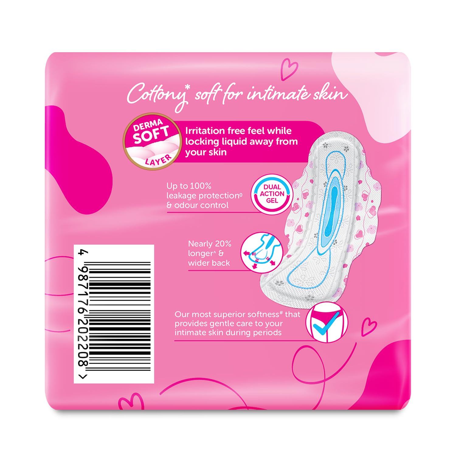 specially designed to provide superior protection with extra softness. Crafted for women who want both comfort and reliability, these pads feature an ultra-soft topsheet that feels gentle on the skin and helps prevent irritation or rashes, making them perfect for everyday and sensitive use.