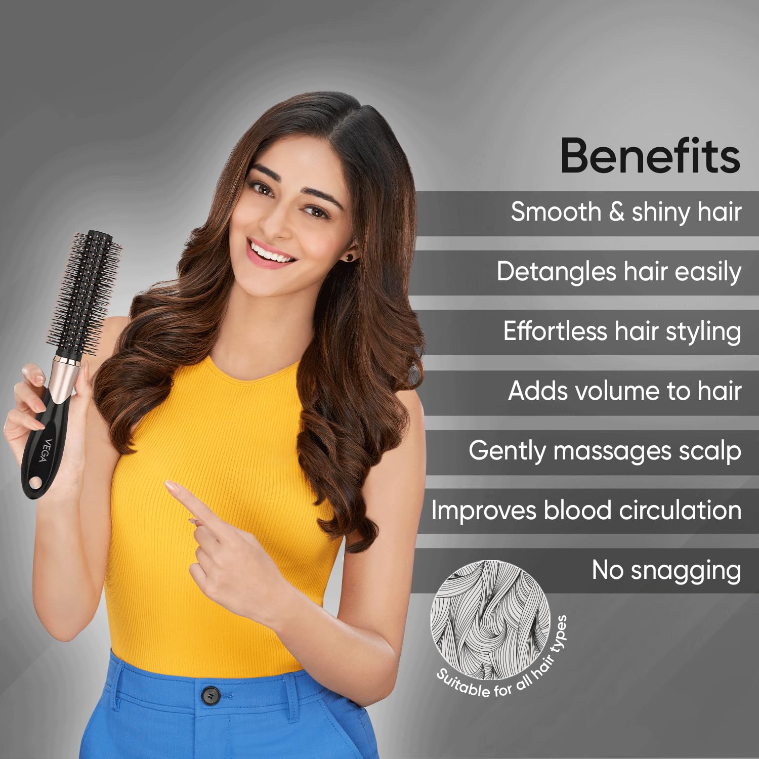 Is the Vega Round Hair Brush E34-RB suitable for all hair types?