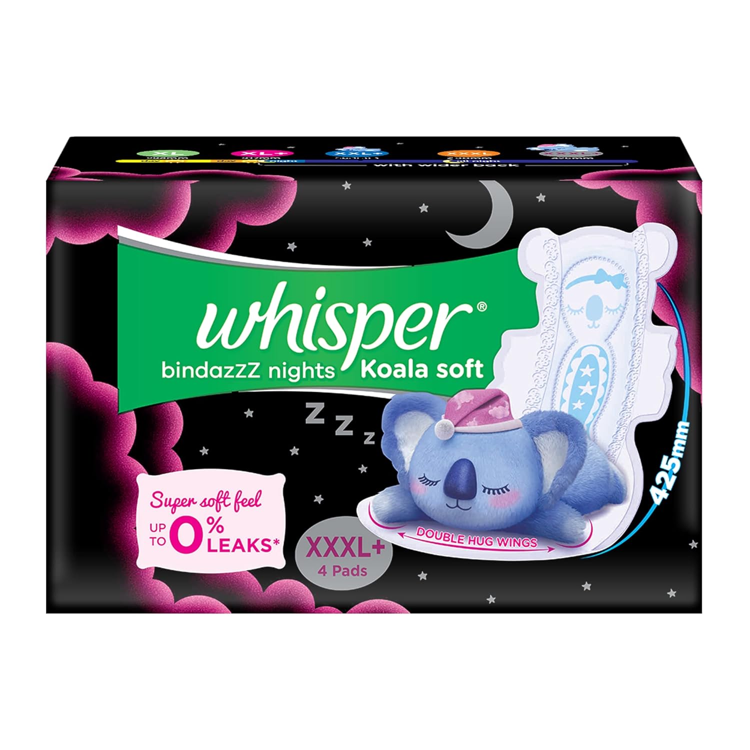 Whisper Bindazzz Nights Koala Soft Sanitary Pads – XXXL+ Overnight Protection with Longer & Wider Back, 4 Pads (Pack of 1)